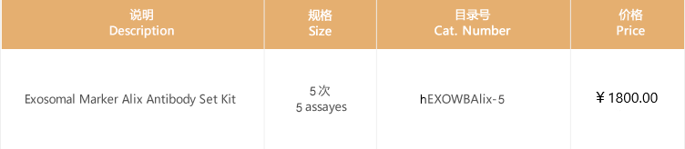 The Exosomal Marker (Alix) Antibody Set Kit provides an economical means to evaluate the presence of exosomal markers. The kit includes enough primary antibody to perform at least 10 western blot experiments for each target. The secondary antibody that is included in this kit has been optimized to enhance the signal-to-noise ratio. We do not recommend using other secondary antibodies with the primary antibodies at this time.
