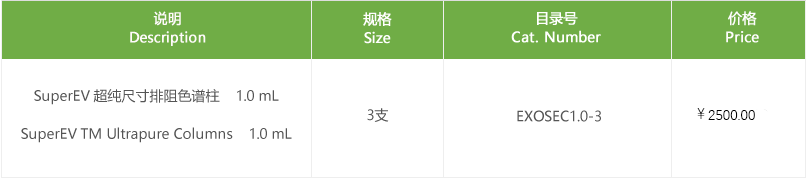 尺寸排阻色譜法(Size Exclusion Chromatography,SEC)被認為是從不同樣本中分離和純化細胞外囊泡(EVs)的最佳方法之一,因為它能夠快速而有效地將EVs從復(fù)雜樣本中分離出來,并能保持EVs的原始形狀和生物學(xué)功能。我們開發(fā)了用于分離EVs的不同類型的SEC柱:SuperEV0.5,SuperEV1.0和SuperEV3.0,適合不同樣本和體積的EVs分離。此外,我們還提供SEC柱和濃縮柱的不同組合,既可以從更大體積的細胞培養(yǎng)上清或尿液中分離EVs,同時又可以將SEC柱分離的EVs進一步濃縮和純化,提供完整的純凈EV的解決方法,適合于EVs的工業(yè)化制備。