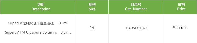 尺寸排阻色譜法(Size Exclusion Chromatography,SEC)被認(rèn)為是從不同樣本中分離和純化細(xì)胞外囊泡(EVs)的最佳方法之一,因為它能夠快速而有效地將EVs從復(fù)雜樣本中分離出來,并能保持EVs的原始形狀和生物學(xué)功能。我們開發(fā)了用于分離EVs的不同類型的SEC柱:SuperEV0.5,SuperEV1.0和SuperEV3.0,適合不同樣本和體積的EVs分離。此外,我們還提供SEC柱和濃縮柱的不同組合,既可以從更大體積的細(xì)胞培養(yǎng)上清或尿液中分離EVs,同時又可以將SEC柱分離的EVs進一步濃縮和純化,提供完整的純凈EV的解決方法,適合于EVs的工業(yè)化制備。
