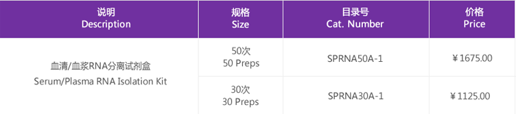 血清或血漿中游離核酸(Free-circulating nucleic acids)通常是小片段( DNA<1000 bp 或 RNA<1000 nt),另外,游離miRNAs可潛在作為疾病(如腫瘤)標(biāo)志物,用于臨床診斷及用藥指導(dǎo)和病情評(píng)估。血清或血漿中游離核酸濃度通常較低,并且不同個(gè)體,不同狀態(tài)下含量不同。 血清/血漿RNA分離試劑盒采用酚/胍鹽裂解液提取血清/血漿中總RNA(含有mRNAs和miRNAs,通過(guò)特異性結(jié)合核酸的離心吸附柱和獨(dú)特的緩沖液系統(tǒng)方便、快捷地純化、洗脫RNA,可直接用于下游應(yīng)用,如realtime RT-PCR,Microarray 基因表達(dá)譜,NGS 測(cè)序等。
