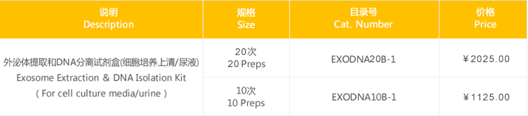 細胞培養(yǎng)上清或尿液外泌體提取和DNA分離試劑盒是包括外泌體提取和后續(xù)DNA分離、純化。首先,應用優(yōu)化的外泌體提取試劑富集血清或血漿中外泌體,然后通過采用優(yōu)化的裂解液提取外泌體中DNA,通過吸附柱(Spin Columns)可方便、快捷地純化和洗脫外泌體DNA,可直接用于下游應用,如realtime PCR,NGS 測序和microarray等。另外,純化的DNA是來自外泌體中DNA,而不含有細胞培養(yǎng)上清或尿液中蛋白質結合的DNA(protein-bound circulating DNA)。